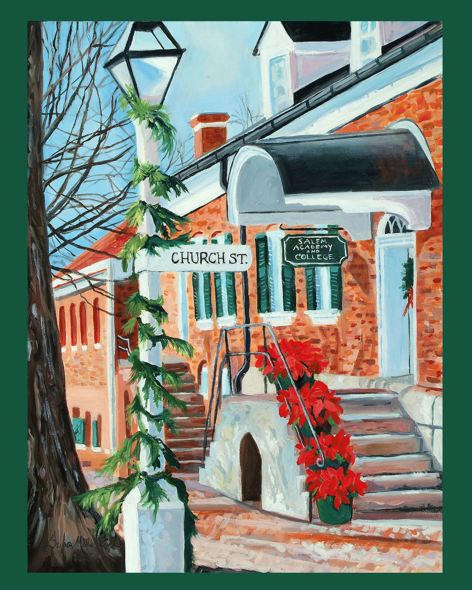 Salem College at the most wonderful time of the year. Enjoy the deep colors and evocative imagery characteristic of artist and Salem College Alumna Susan Maley Rash in this unique, collectible wooden jigsaw puzzle. Dozens of "whimsy" pieces bring the joy of Salem College and Old Salem at the Holidays. Order now and receive in time for the Holidays. All pre-orders are 10% off with the code "SIGNMEUP!"