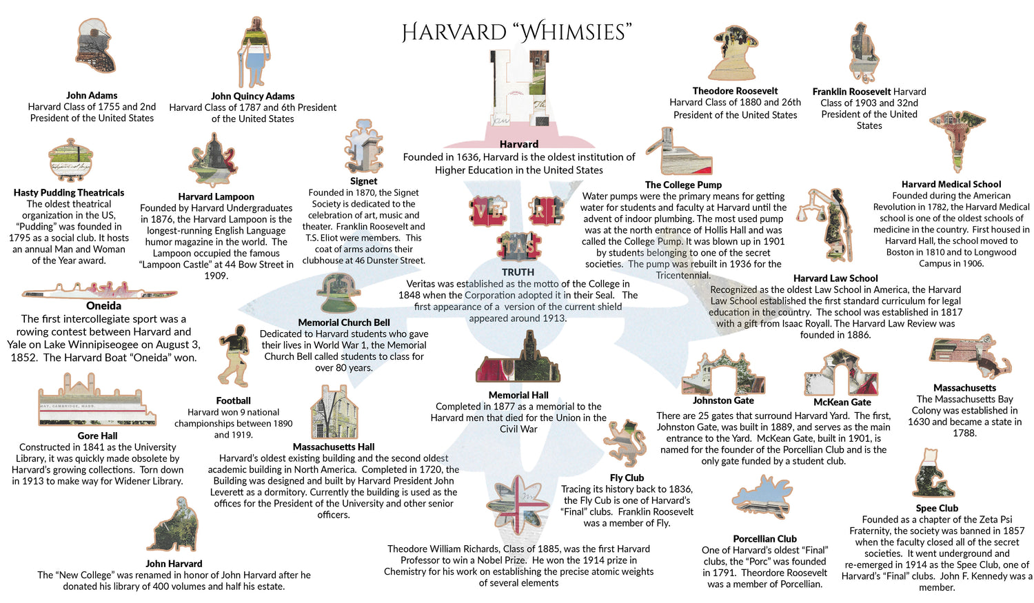 The majesty of turn-of-the-century Harvard University comes to life in this 425-piece handcrafted wooden jigsaw puzzle. The artwork features vintage postcards from the early 1900s featuring many Harvard landmarks that can still be seen today. The jigsaw puzzle features dozens of "whimsies," which are specially shaped pieces that tell the story of Harvard. Each postcard and whimsy are described in an informative and attractive booklet that comes in each handmade wooden box. This limited edition, 425-piece wooden jigsaw puzzle measures 14" x 23" and is sure to be a valued keepsake for any Harvard fan.